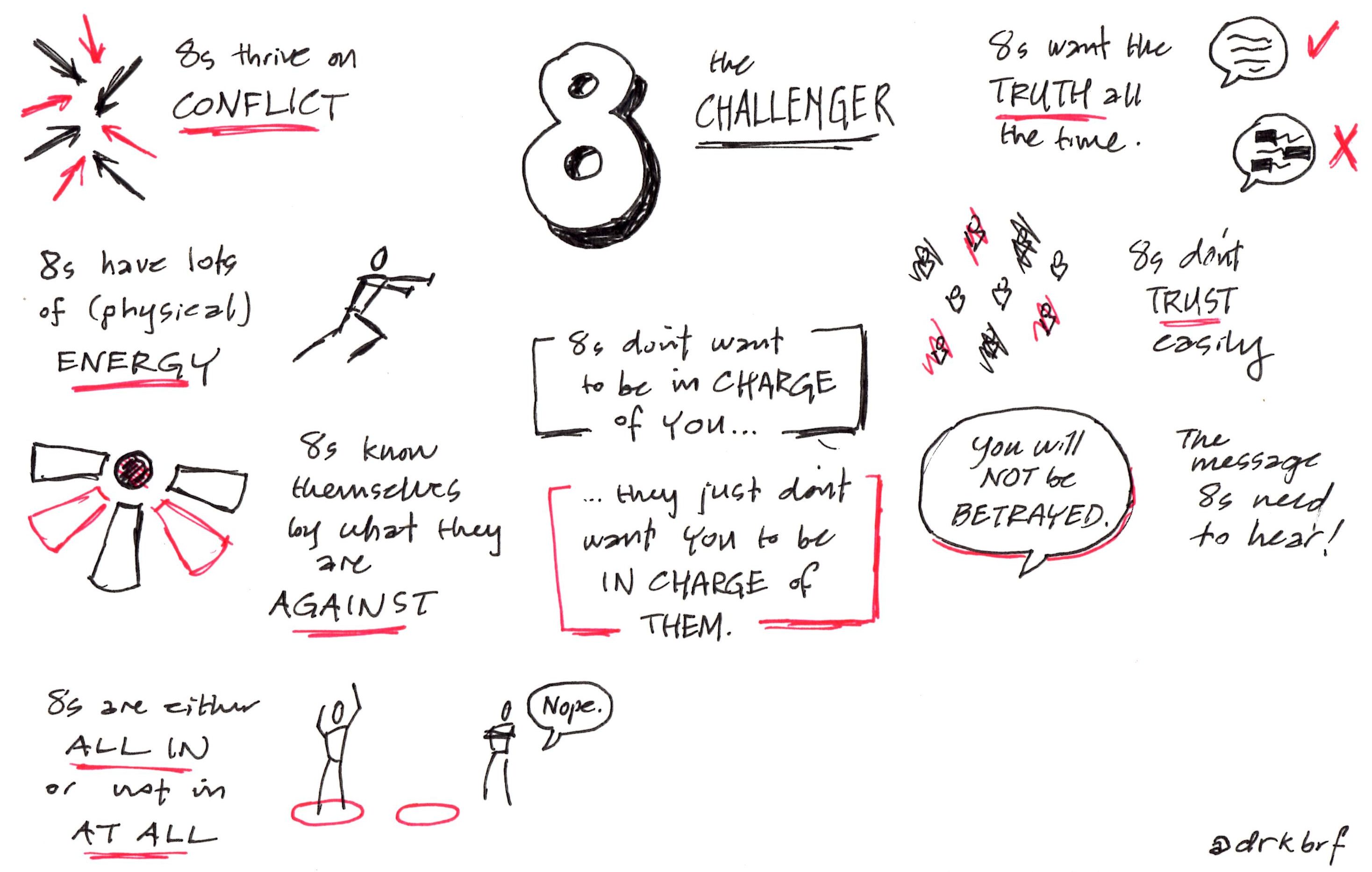 TYPE EIGHT: THE CHALLENGER. Commanding, intense and confrontational, they are motivated by a need to be strong and avoid feeling weak or vulnerable.