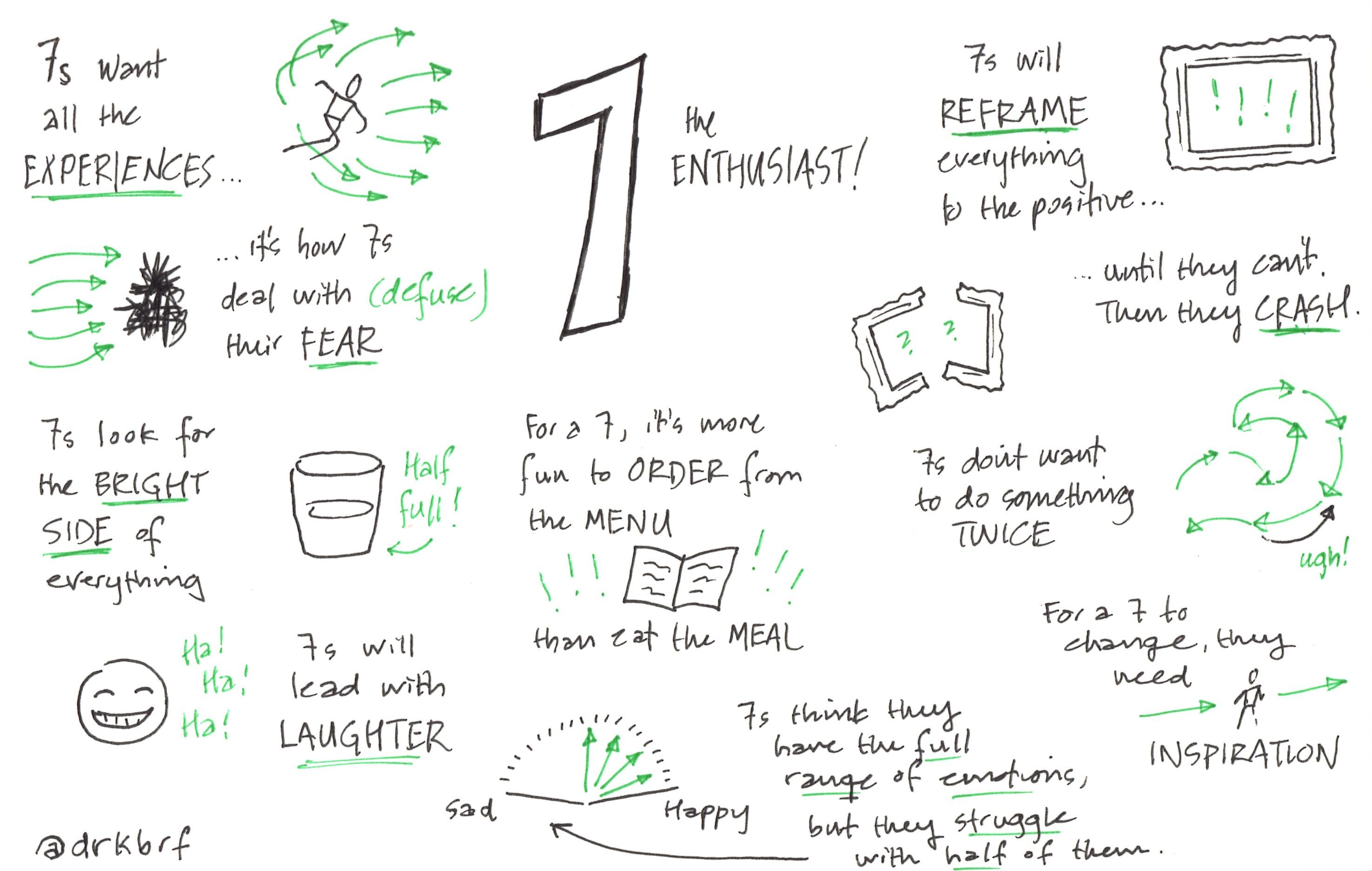 TYPE SEVEN: THE ENTHUSIAST. Fun, spontaneous and adventurous, they are motivated by a need to be happy, to plan stimulating experiences and to avoid pain.